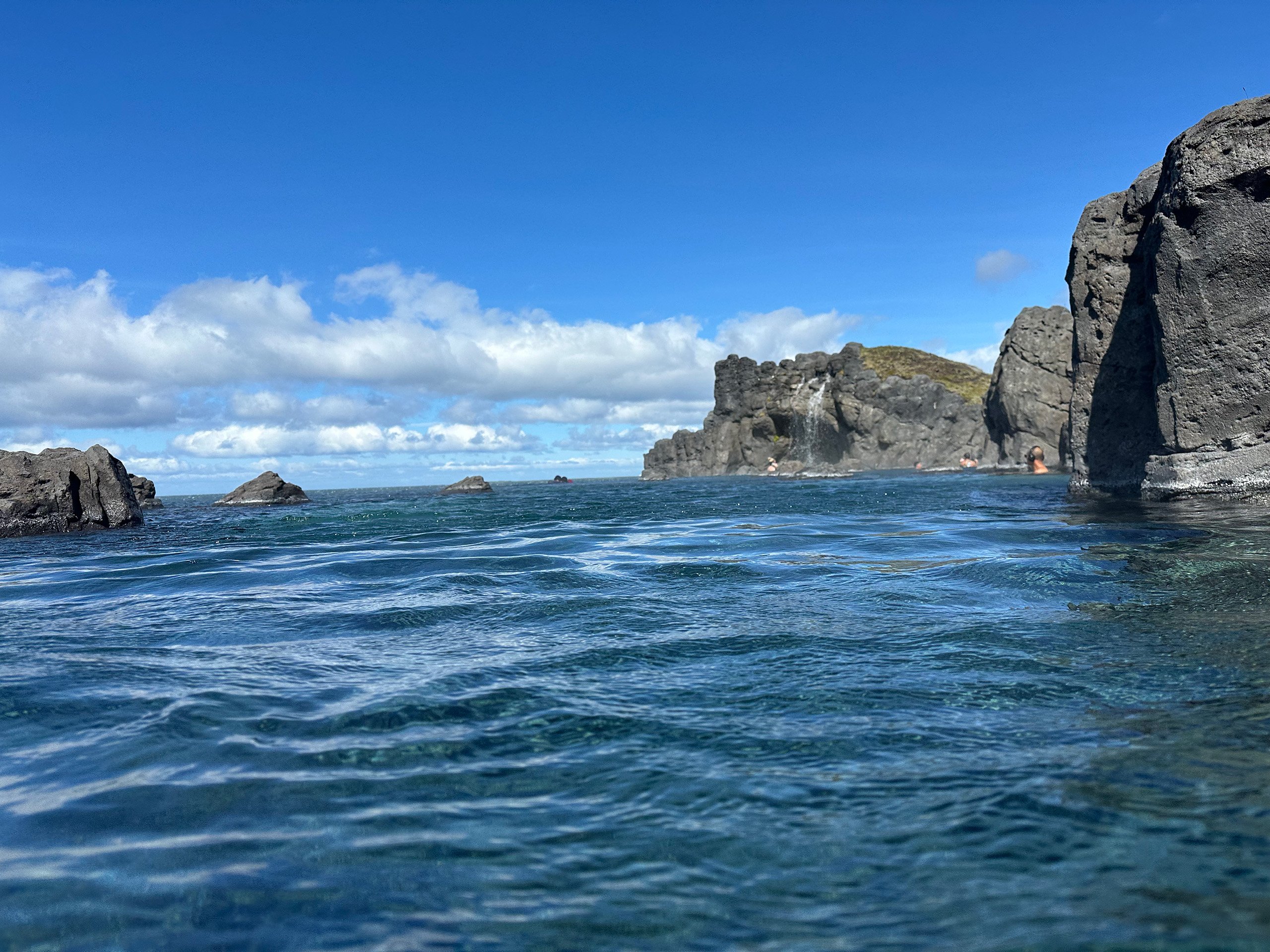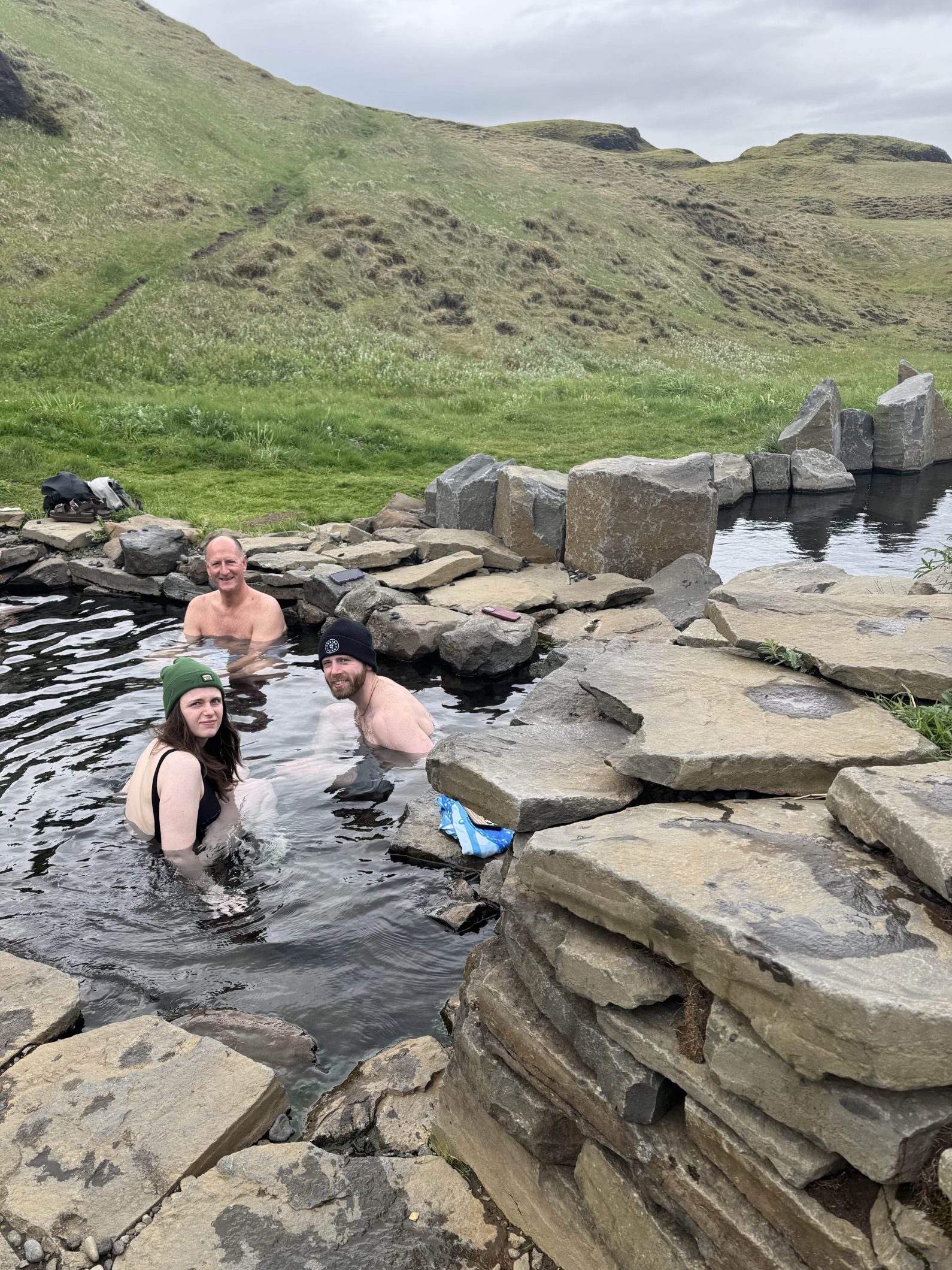 We arrived at Hvammsvík and spent the next 2.5-3 hours soaking in the springs, looking out over the ocean. They had 8 different ones, one of which was ocean temp. Matt did the cold plunge into it but noone else wanted to join him. No, thank you! We did get pelted with hail briefly though!